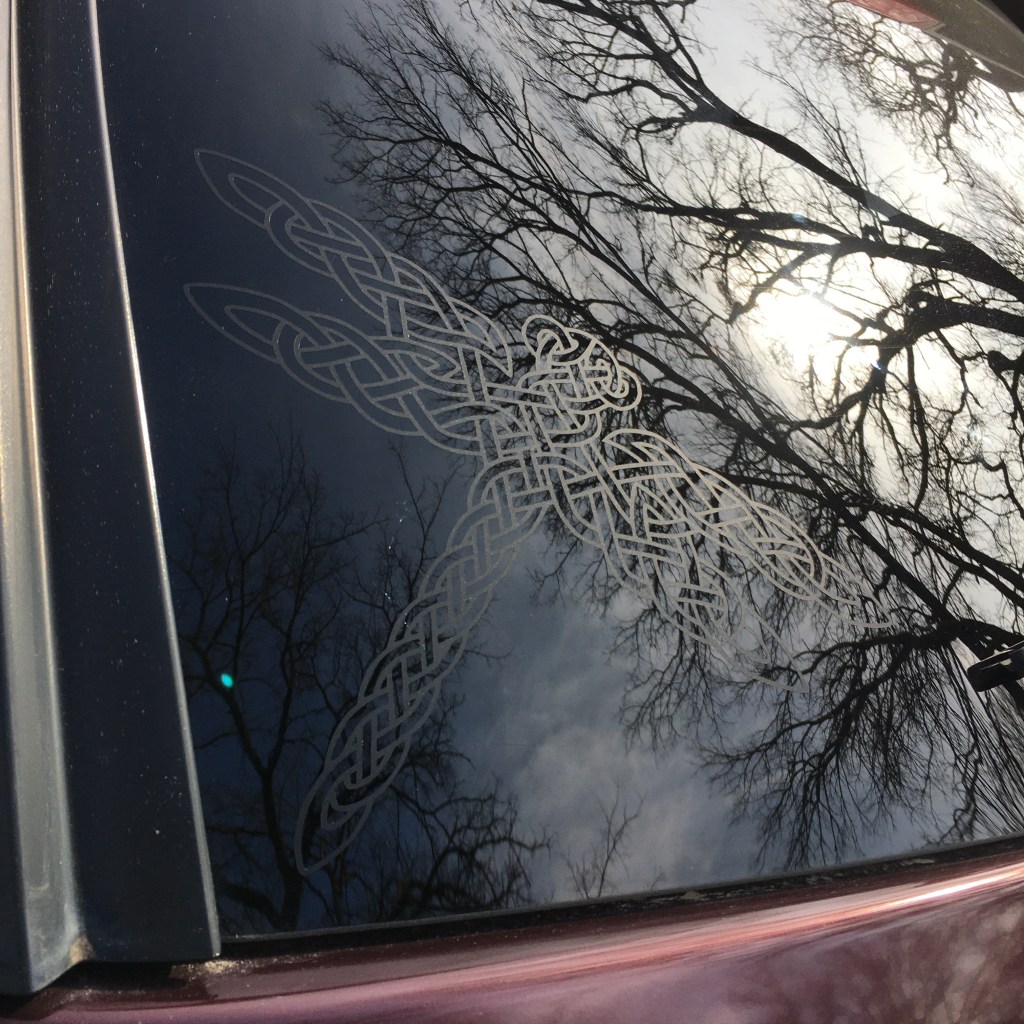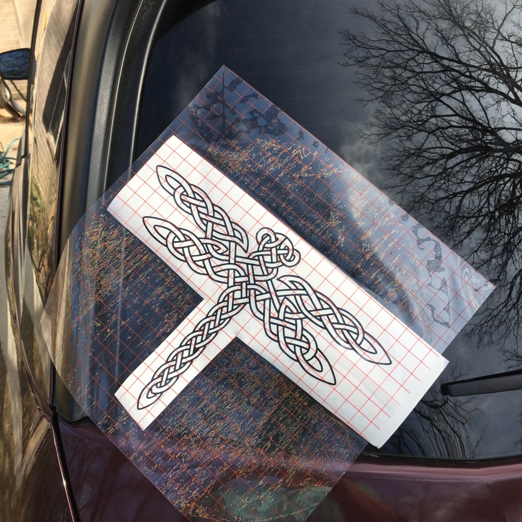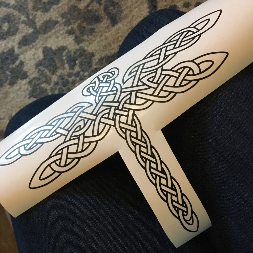 I liked the way my husband’s matte black decal came out so much that I made one for me. Not a castle, but a celtic knot dragonfly that I designed years ago.