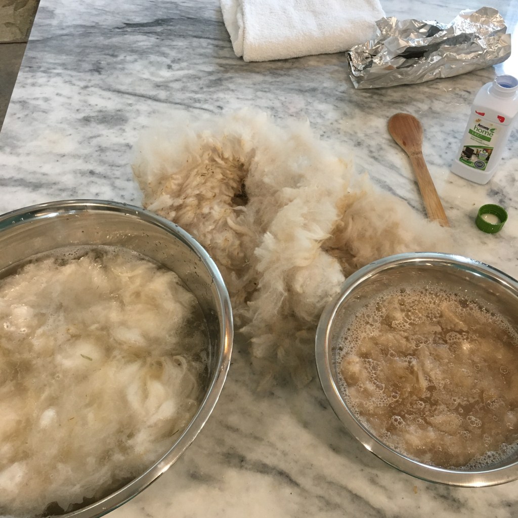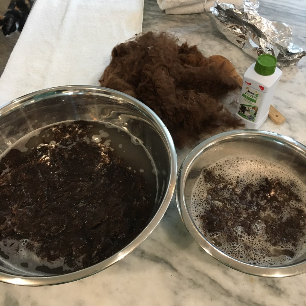 I used a capful of Amway LOC soap in the wash bowl, and let the fibers soak for a few minutes. Since alpaca fiber doesn’t have lanolin I didn’t have to be as diligent with keeping the temperature consistently hot. I used hot water from the tap for both the wash and the rinse. I gently squeezed out the soapy water before putting the fiber in the rinse bowl, let it sit, then gently squeezed out the rinse water and rolled the fiber in a towel to remove most of the water.