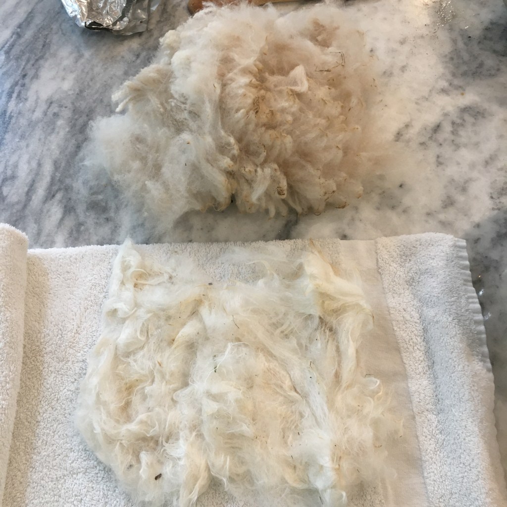 The alpaca fleeces seemed relatively clean to start, but as you can see in the picture of Sugar Plum’s fleece above, there was still a fair amount of dirt in there! Which is to be expected, since alpacas like rolling in dirt.
