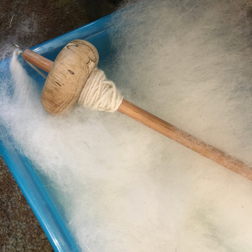The alpaca fleece is dry and I am starting to card and spin it! My plan was to card it all, grade it by color, then spin, but my rolags (the rolls of carded fiber) are so fluffy that I don’t have room to store them like I did with the merino wool rolags. So I decided to spin as I go. If it were possible to spin clouds, I think this is how it would feel. The soft alpaca rolags are light and airy but are spinning up easily. I’m using my homemade top whorl spindle and planning for spinning everything as Z spun singles (as opposed to the opposite direction referred to as S). What am I planning for the finished yarn? A hat of course. I’ve read that alpaca doesn’t have the same elasticity as wool, so I think testing it on an item I am very comfortable making is a good start.
