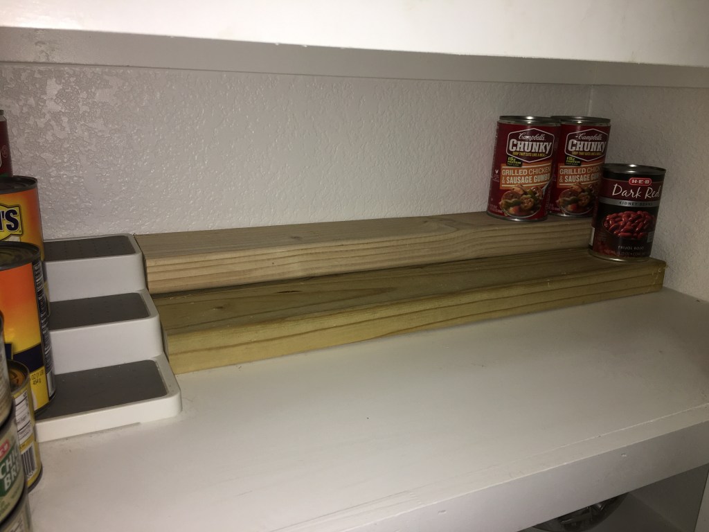 So you’ve done your Hamsterkaufen (a great German word for accumulating and hoarding food and supplies), and you’ve run out of canned good space, or you are tired of not being able to see what is in the back of the shelf, here is an easy way to make your own stands. Three 2x4s, two in the back, one in the front, make great shelves for canned goods. If you don’t have 2×4 drops laying around in the garage, you might need to buy a 2×4 and cut to length using a hand saw or miter saw. No screws, no fasteners necessary!