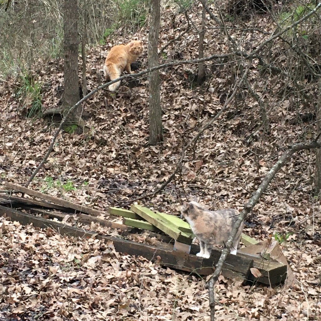 I was heading out to change the memory card in the trail cam and Sophie (our gray calico) was walking along with me (she likes to take walks in the woods with us), and Big Orange Tom was right behind her. This picture was taken moments after he realized I was there. He was focused on other things. Sophie is fixed, I am certain he is not. He does seem to have a thing for Cali girls. Hello spring. (And hello summer, since we have already had highs over 80 degrees Fahrenheit. Yuck.)