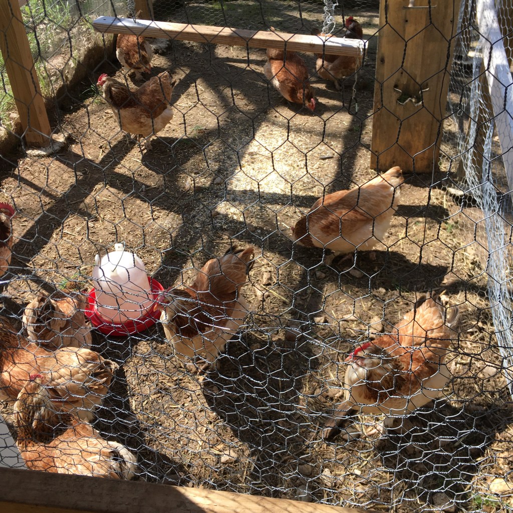 The sun has started to shine again. The spring rains aren’t done, but my eldest and I had some time to clean out the coop. Exercise and cleaning and out of the house! We put the chickens in a run with some scratch and some water, since they freak out when we mess with their coop. It worked well to have them not underfoot and not panicking.