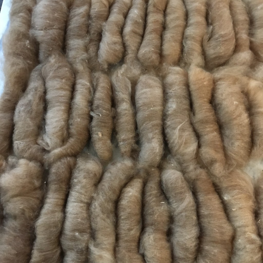 I’ve moved on to my next color blend: fawn mixed with dark brown. I loaded the fawn color on my carder first, then added the dark brown so the fawn wouldn’t be overwhelmed by the brown. This worked much better. When all the rolags were prepared (I used a large box to hold them this time), I sorted them by shade in three groups. The idea is that if I spin each group, then ply them together, I will still get a gradual color fade in the final yarn. We’ll see.