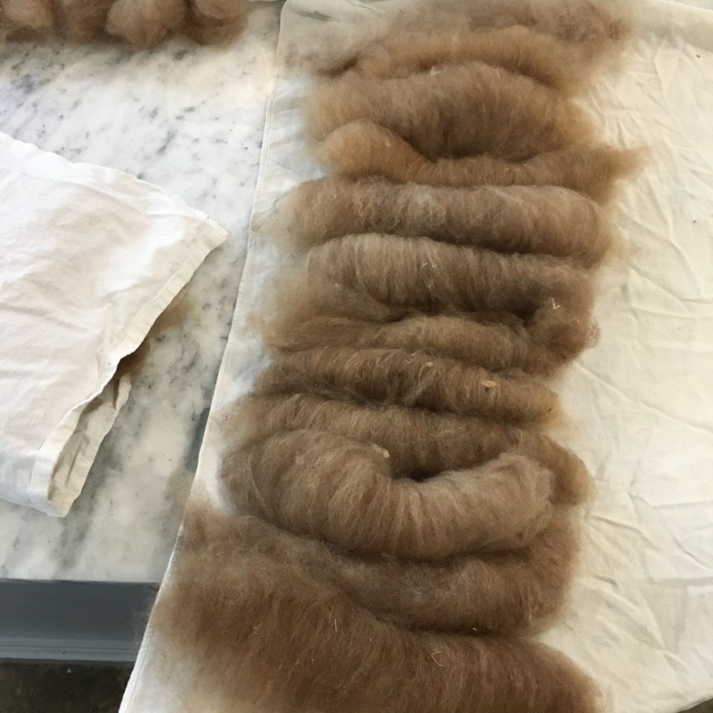 To keep my colors sorted, I gently folded each group in a dish towel so they stay neat and in order. There is still a fair amount of vegetative matter (VM) in the fiber, even after carding, but I have found that when I spin it is easy to remove most of it by plucking the yarn before I wrap it on the spindle. Some stubborn bits needs to be pulled out, but it is easy to feel and see where they are in the twist.