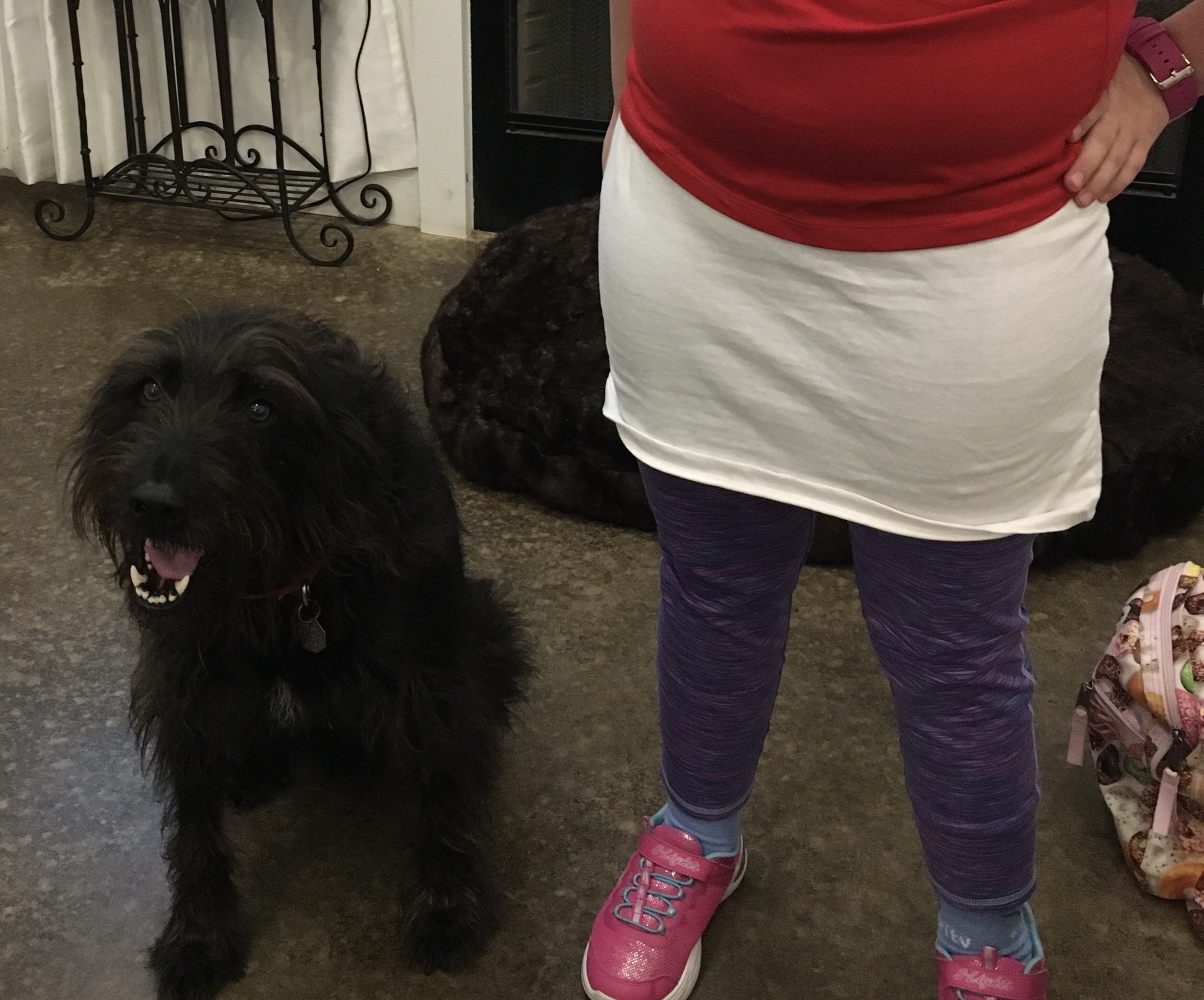 The skirt my youngest is modeling (she insisted our dog be in the picture, and he is so cute) is made from the bottom of a t-shirt. Following the rules and repurposing? Win win. I sewed some soft elastic at the top to help it stay on. I am going to make her some in every color! She gets to wear her favorite leggings and t-shirts, and we follow the rules. So, I’m advocating a mini skirt return… with leggings.