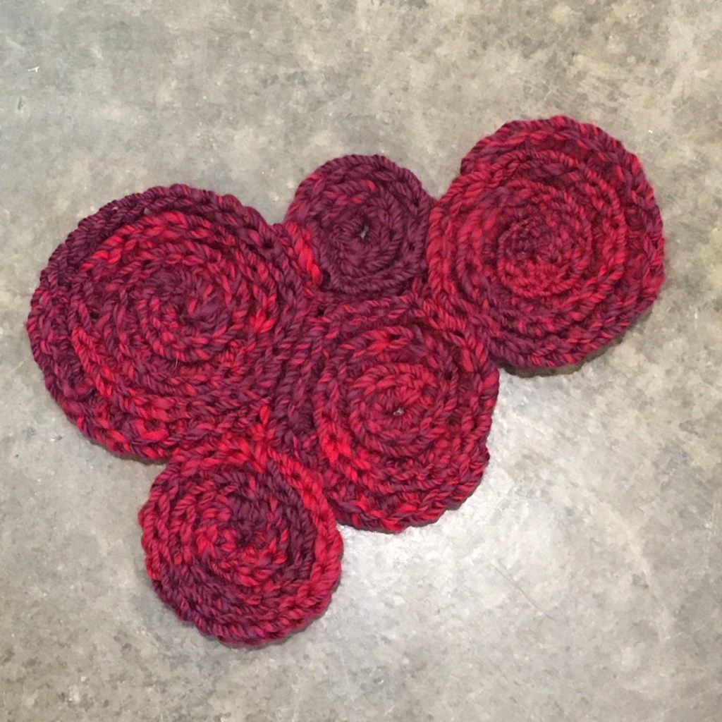 I have an idea rolling around in my head for an application for my alpaca yarn. I pulled out some spun merino to test the concept. Basically, it is varied sizes of spirals sewn together. I used a half double crochet to make the circles, stitching not into the front or the back loop, but the third loop. It results in quite a pretty spiral. This test swatch will suit nicely to protect my pots and pans now that it has successfully demonstrated the technique works!