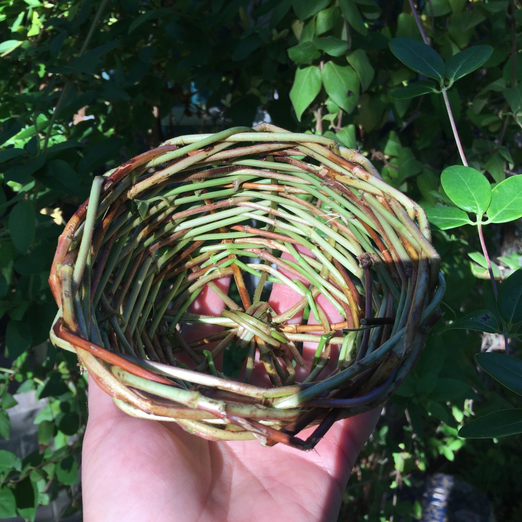 It is a rough little basket, but was straightforward enough that I looked up honeysuckle basket making online for more information. It turns out the best recommended time to harvest honeysuckle vine is in the fall, and once harvested, the vines can be stored. Then the traditional method is to boil the vines to kill any bugs, assist in removing the bark, and make the vine more pliable before making a basket. So I’ll give that a try this fall.