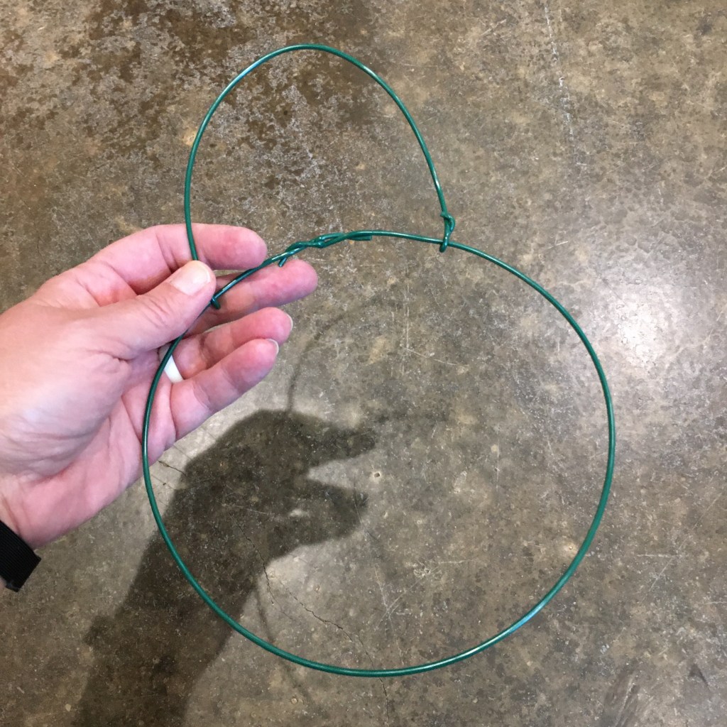 Awhile ago I switched to wool dryer balls in the dryer instead of dryer sheets. For the most part they work well (I do still use the sheet if I have a fuzzy blanket because the static is too much for the wool balls). I’ve been keeping the balls hanging next to the dryer in the nice cotton drawstring bag that they came in. Except getting the balls out of a drawstring bag when it is hanging is irritating. I thought about using a simple basket, but there is no where near the dryer to set a basket where it won’t fall off. It finally got to a point that the irritation was more than I could bear (honestly, it doesn’t take much right now). So I crocheted a hanging mesh bag with a wire rim so it was easy to get the balls in and out.