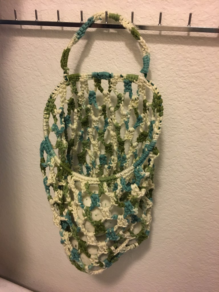 I started with coated steel wire from my wire stash. I used some variegated cotton, also from my stash (yeah, I haven’t been to a craft store in two months, <twitch>). I formed the wire into a loop with a handle, then did a single crochet around the wire to cover it. I crocheted the mesh (2 double crochet, chain 5, repeat, for those that want to know), from the top down and then decreased to close the bag. It functions! Hurray! It is also kind if fun to throw the balls at the bag to get them in.