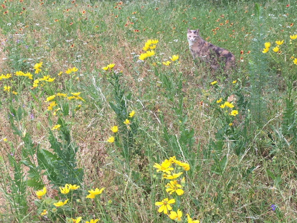 This is Sophie’s meadow. She likes to hang out there and seems to be the queen of this space since I rarely see other female cats there. Or maybe she is more confident out in the open because she has the best camouflage in the neighborhood. I just had to take her picture as she stood in the cut daisies (yellow), hedge parsley (white), and Indian blankets (red and orange).