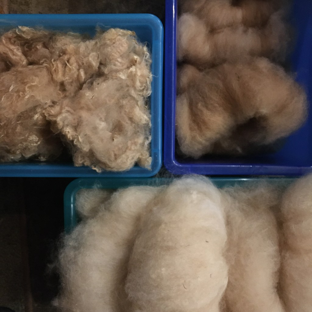 For my next yarn color it was time to use Donna Bella’s fleece (a fawn colored alpaca from Alpacas of Aledo). I was not planning on blending this round, but as I was carding I noticed a distinct color difference in some of the rolags (the roll of fiber that comes off the carder). So I separated the lightest and darkest colors and will spin them separately. I’m also going to reduce the number of rolags I spin per spindle to 10 to lighten the weight when I ply the last bits. (I used 12 rolags per spindle for the dark brown and fawn blend.)