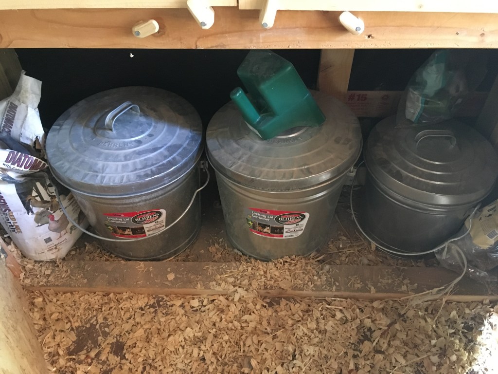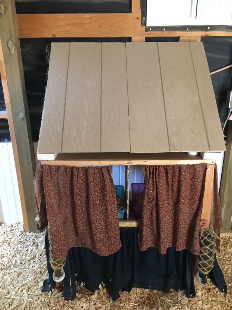 Work bench: Having a counter height work area inside the coop makes chicken health checks and treating bumble foot so much easier. I put a slanted lid over the work bench to keep the chickens from roosting on top, and they love the plastic bins on the shelves underneath (behind the curtains) for nesting. There are four nests under the bench, and all of them have been used. Because there is a lid on top, I can store my most used supplies and scale inside. I can even prop open the lid with one chicken under my arm.