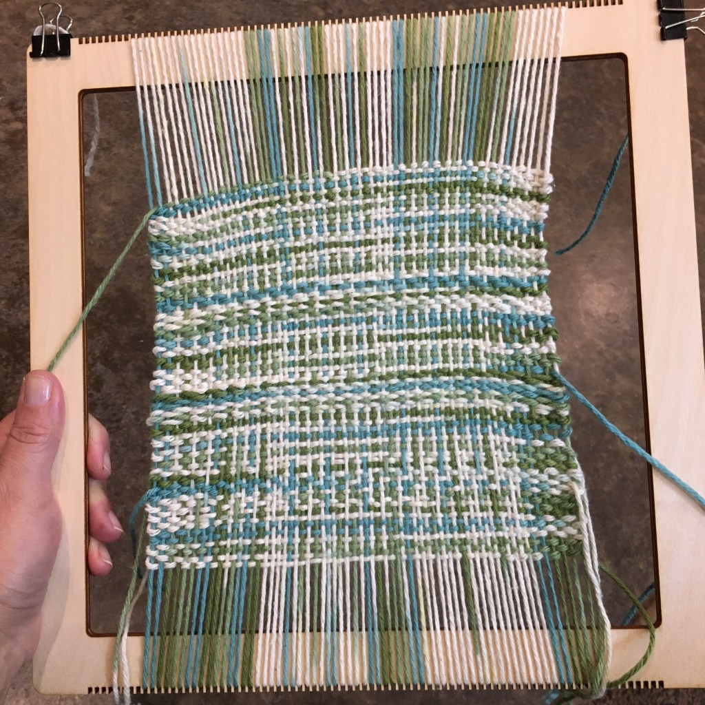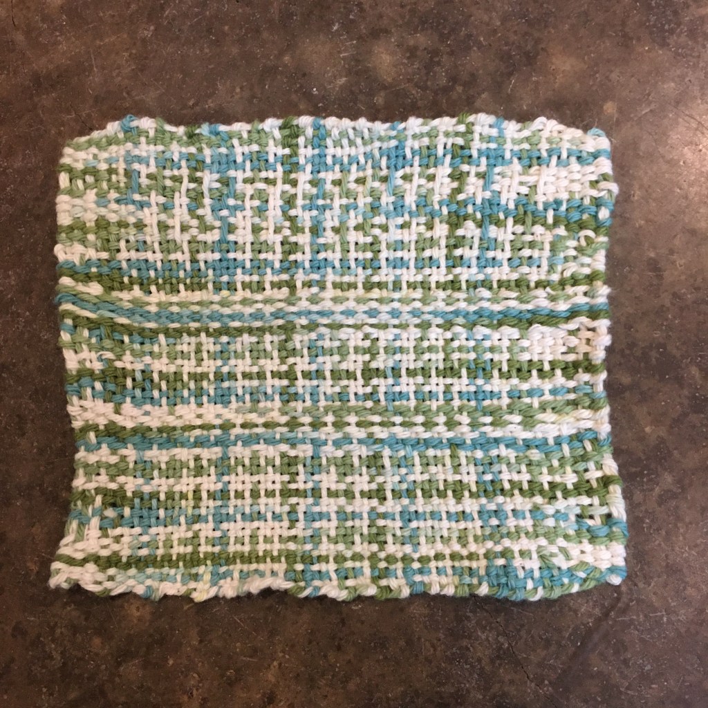 I gave myself more room on the loom this time, going for a smaller washcloth. I’m still having trouble with tension, but it is getting better. I tried some areas of linen weave, but I don’t quite have my head wrapped around the technique yet. More practice is required. It was easier to pull the weft through the work for the fringeless method to finish off the washcloth, so working smaller was a good choice.