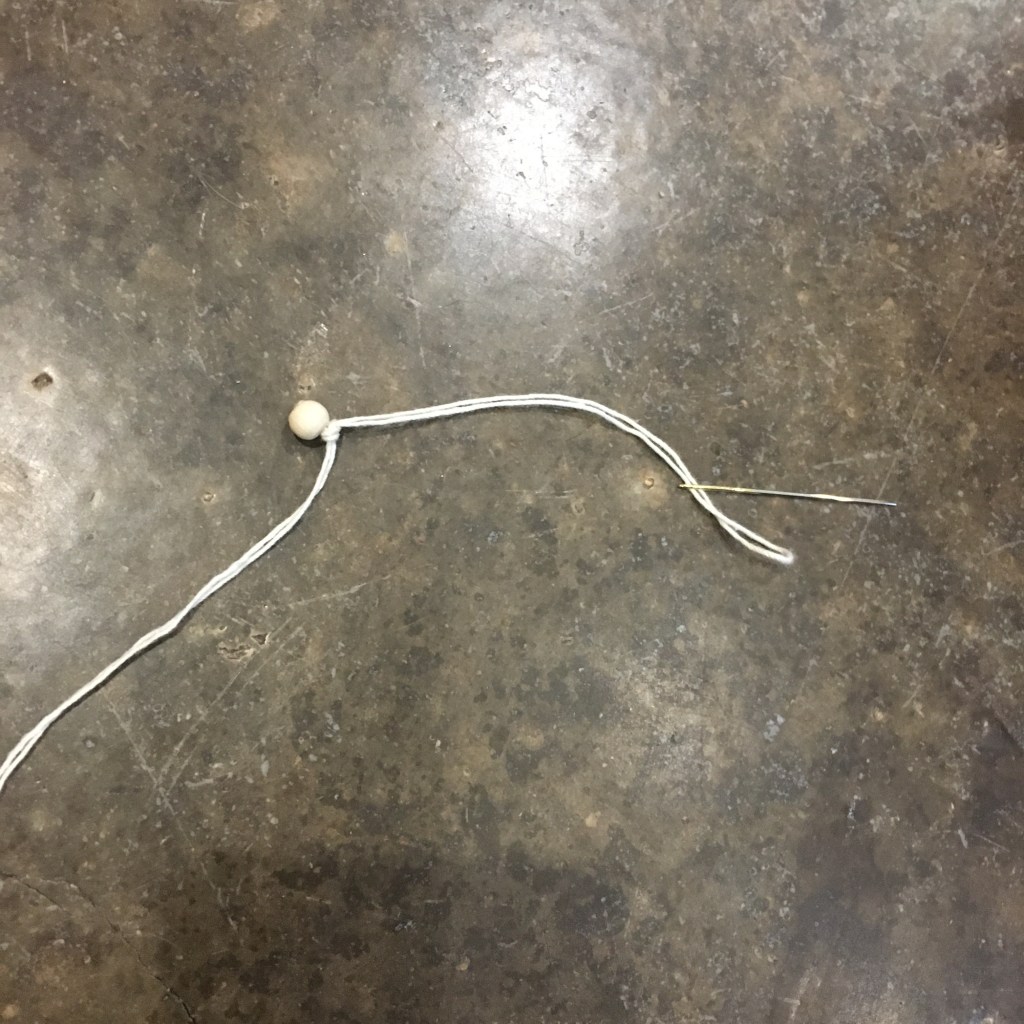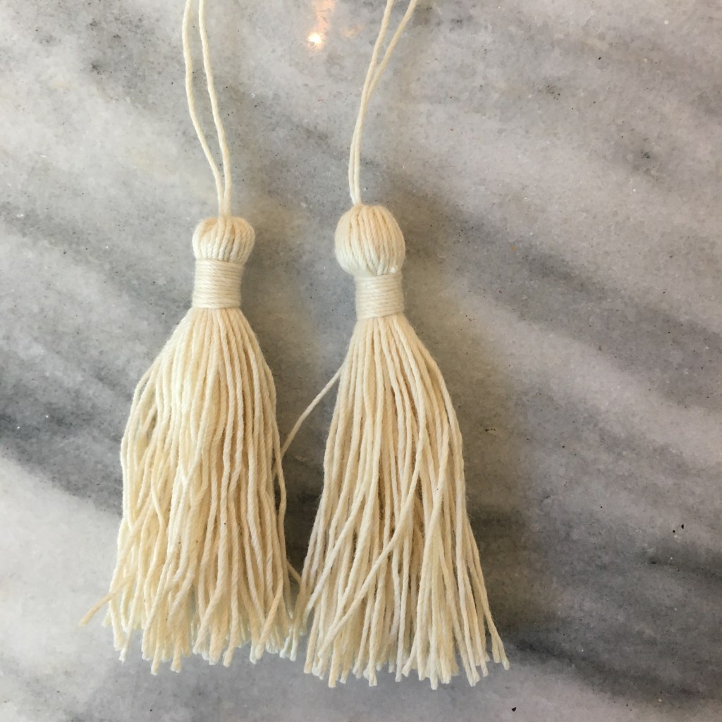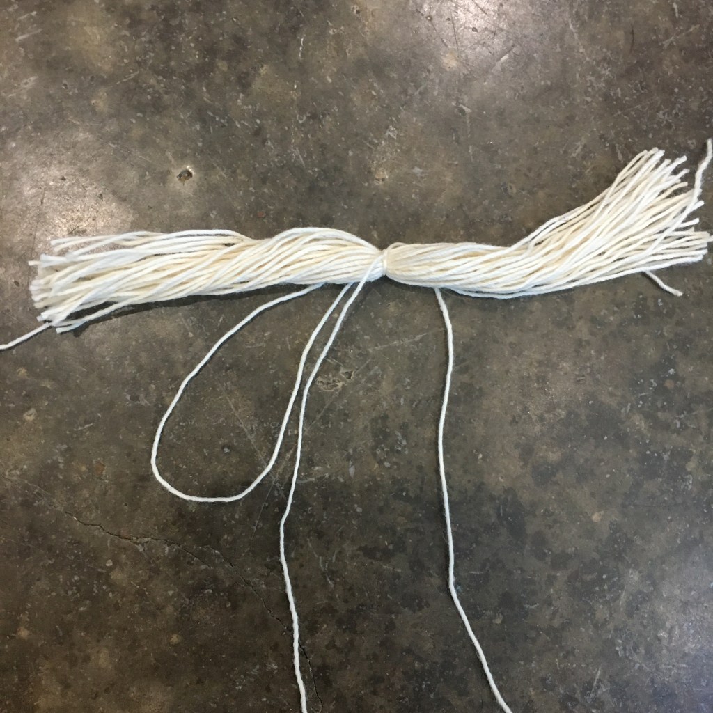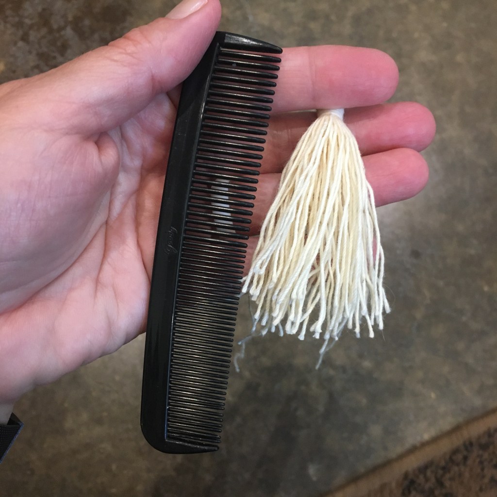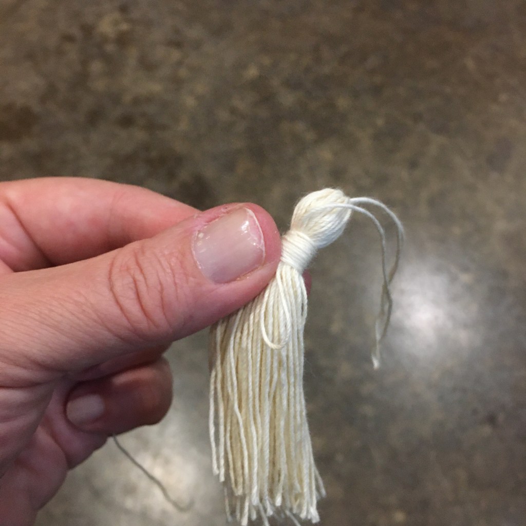 40 wraps of thin cotton on a 3” rectangle of cardboardCut bottom loops onlyUse another strand of string to tie the middle (if not using a bead, tie a loop)Fold a string in half, thread through bead, tie the bead about 3” from the loopPoke needle through the center of the bundle of stringArrange string evenly around beadWrap tie from the bead toward the tassel, put the end through the loop, pull ends under wrapsA comb works well to straighten out the tassel strandsTrim tassel. Tassel on left has no bead, tassel on right has a bead