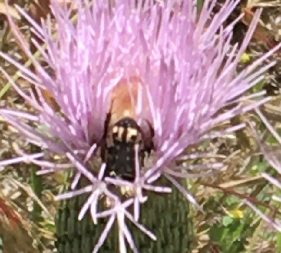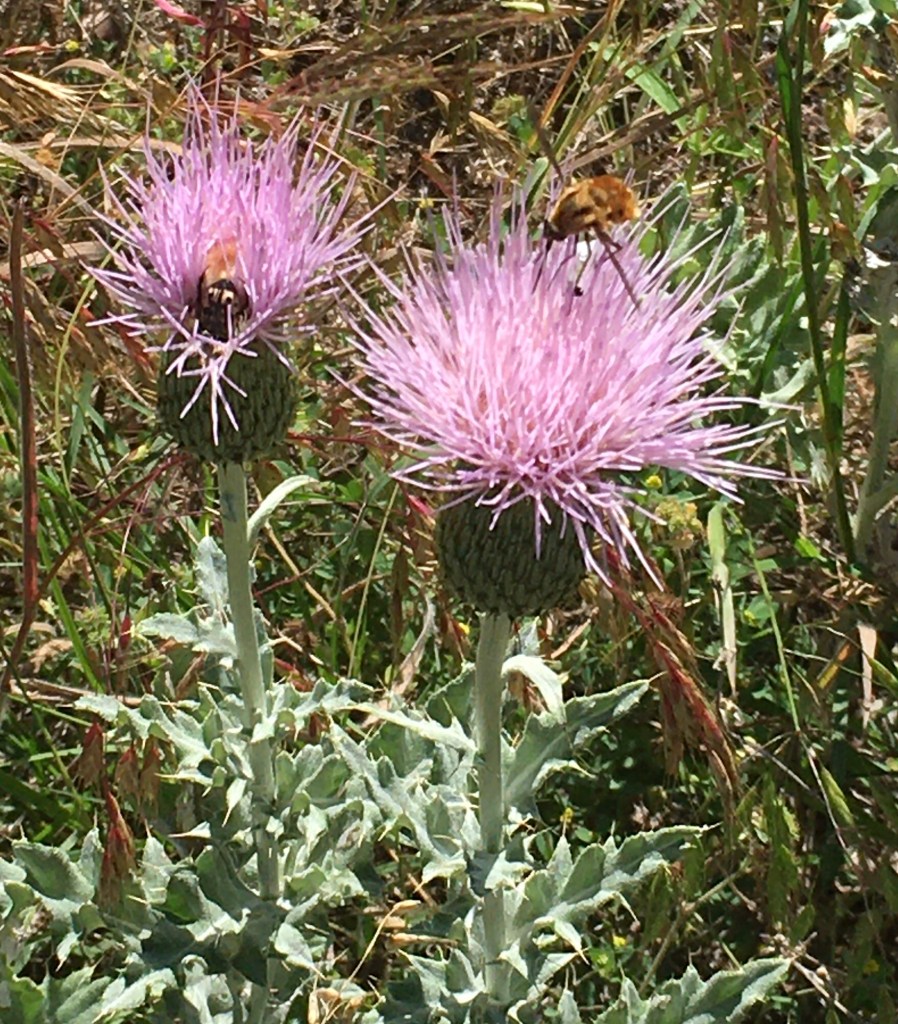 On a walk at a local park, I stopped to take a picture of thistles. I love the look of these thistles! The leaves are silvery, and I like the tassel; yes they are prickly, but at a distance that has its own kind of charm. I ran the photo through the iNaturalist app to figure out what kind of creature was sipping nectar, and it suggested thistle, and two very different insects. Huh? Then I looked closer and there are two insects in the picture! The bee fly on the bloom to the right, and the back end of a flower scarab in the bloom on the left. I have not documented either creature, so it is quite the exciting picture!