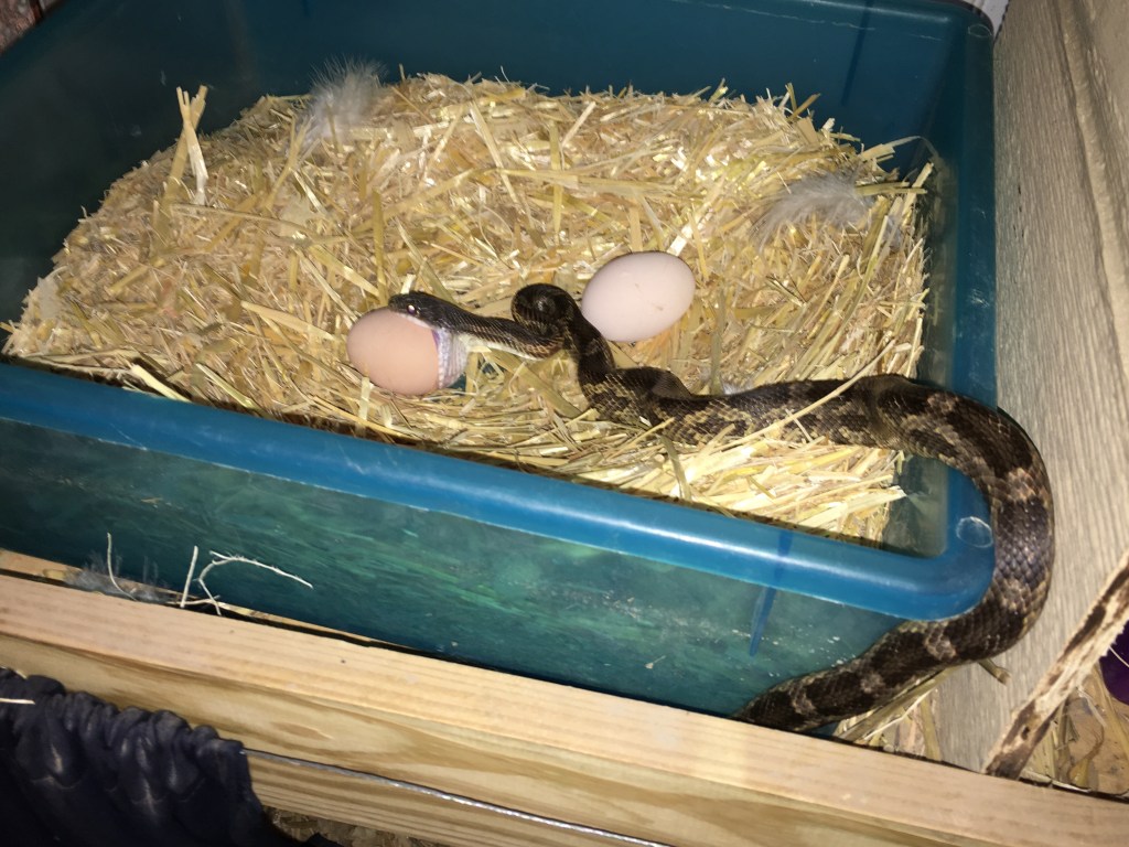 Well, attempted egg thievery. I went out to check the chickens around noon and found a 4 foot long Western Rat Snake in a nest trying to eat an egg. I ran back to the house to get my phone, turned on the video, with light, and she (?) still didn’t care I was there. The egg was too big, though. I called for my eldest to bring the snake grabber (yes, I went into the house for my phone and not the grabber), and we gently removed the snake from the nest and relocated it outside the coop.