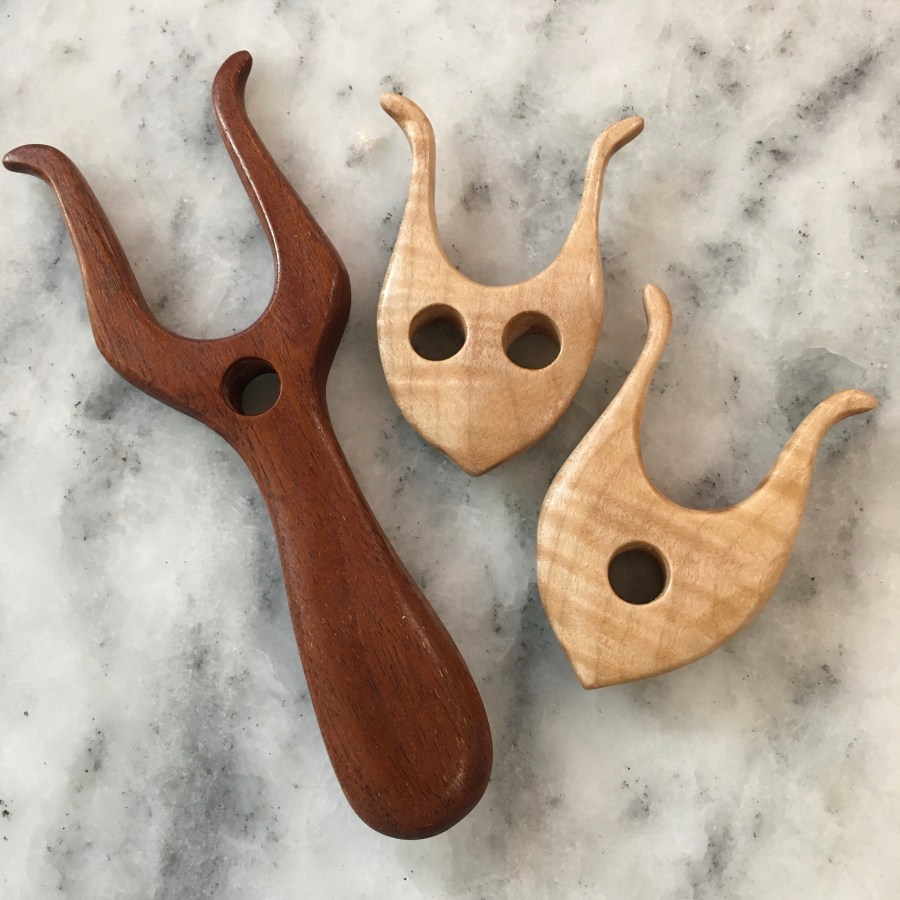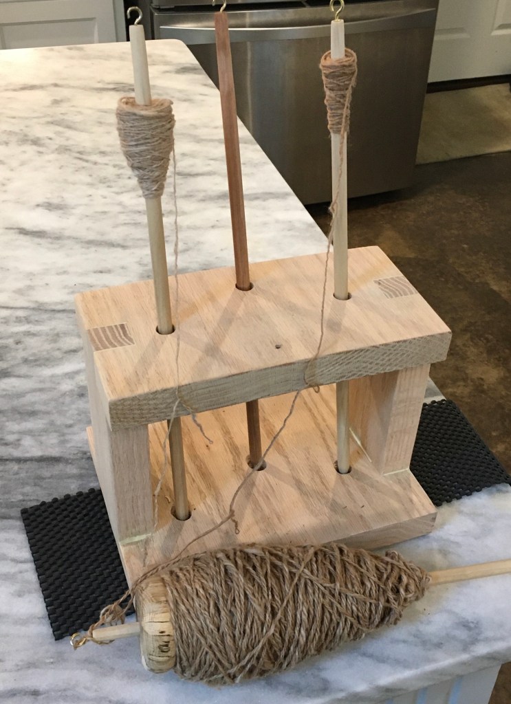 When the glue was dry, I did apply some wood filler to the gaps, and when that was dry sanded the whole thing first with an orbital sander, then by hand with 120 grit sandpaper. Before applying finish, I tested plying with it. I have seen another style with a loop to feed the threads through, so I tried that. Turns out it is easier not to use a loop. I also put a rubber mat under the base to keep it from sliding, which isn’t a bad idea, but the weight of the wood did a good job keeping it steady.