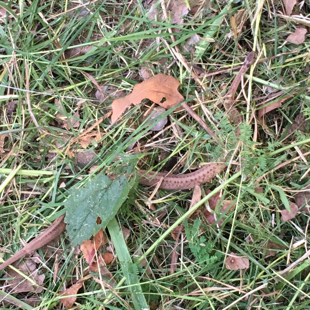 We have a lovely patch of buffalo grass happily spreading near the coop. In order to keep it from dying I took a rake to the trimmings to keep them from matting up and killing the roots. A little brownsnake kept me company.
