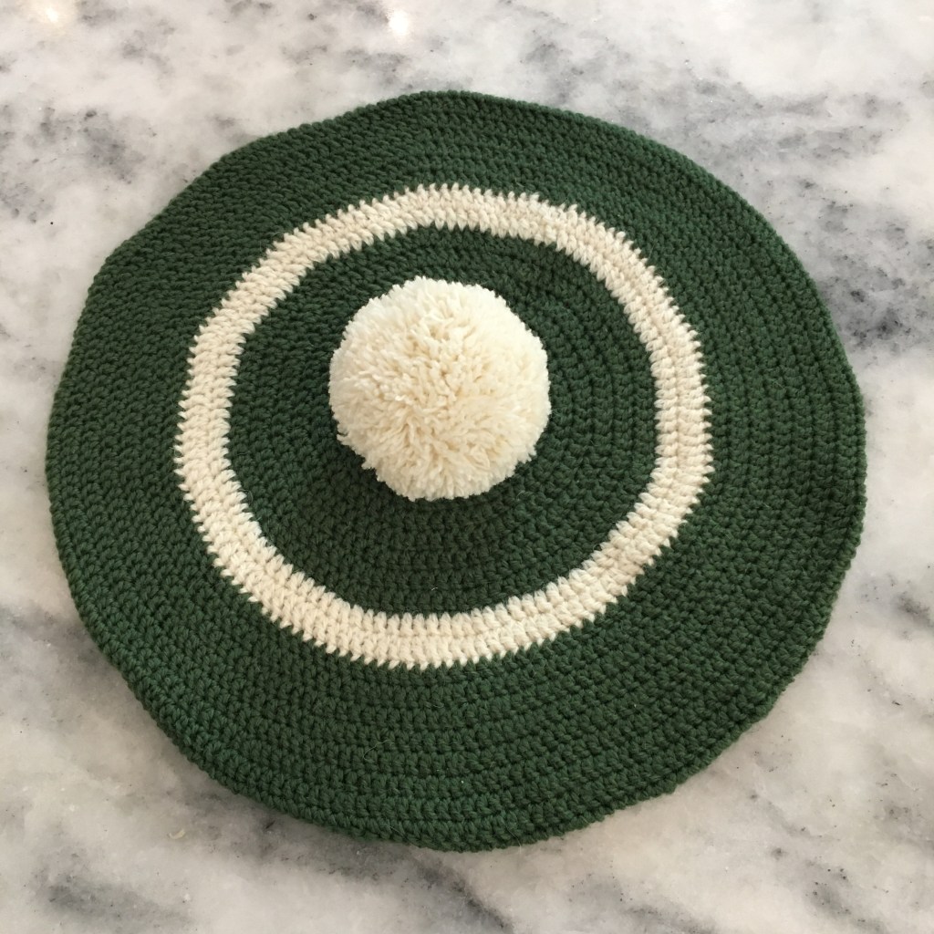 My eldest likes to play Pokémon and picked for her avatar a green and white beret. As I was watching her play, I realized that I could make a hat like that! She didn’t make a negative face, so I sat down with my fingering wool and worked on recreating the hat (but without the cross bar, as she requested).