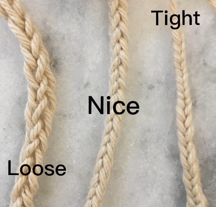 Above is an image of how the lucet cord looks with different tension issues. If you pull the loops too tight, it is very difficult to make new loops because it is harder to pull the yarn through. Too loose and the cord doesn’t have the classic look. A classic lucet cord is square and even. Making the cord is also relaxing and a little addictive once you have the moves down. I’m thinking of keeping a ball of yarn and a lucet in my bag for moments I need to fidget!