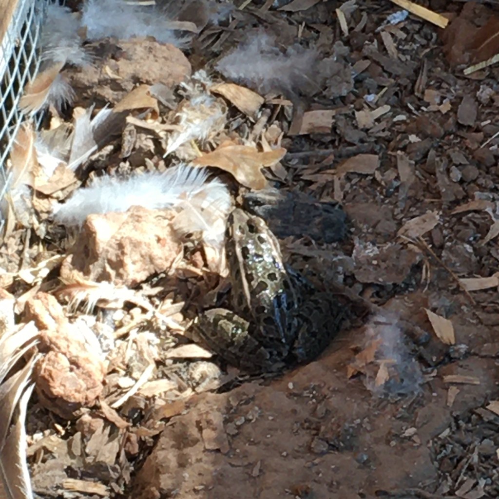 A leopard frog found his way into the chicken coop recently. I couldn’t catch him the first day, but I found him in the same spot again the next day. This time I was able to catch him and relocate him nearer our neighbor’s pond.