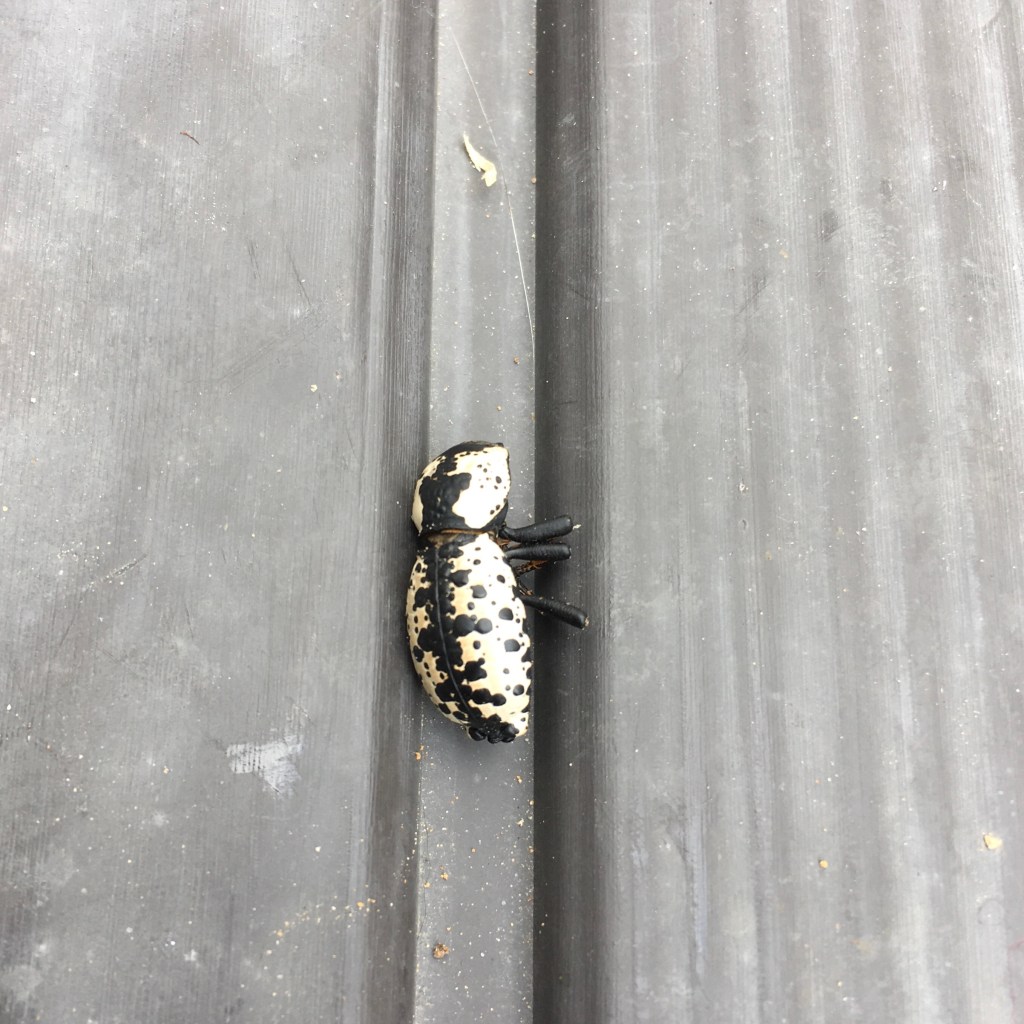 A bit after we first moved here nearly three years ago, I saw a cool insect and looked up “black and white beetle” to find reference to the ironclad beetle. (I’m not sure why I didn’t get a picture at the time.) It is fascinating how much we don’t know about it! Here is a good blog post. I didn’t see another one until a couple weeks ago. Unfortunately, it was dead in the catio. Bummer. I saw it in there again later and pulled it out to get a picture, because they are really cool, even deceased. I left it on the deck box intending to come back and see how hard the exoskeleton really is and investigate if I could make something from it. I was quite surprised when I came back later in the day and it was moving!! Rather than dismantle it, I transferred it to the wood pile in case it really does eat lichen and prefer dead wood. I also read another blog that mentions that they play dead. That is some serious method acting to play dead for over a week, but I checked on it again a few hours later, it was moving again! I put a lichen covered stick near it and when I checked the next day, it was gone. I hope it is out making more iron clad beetles!
