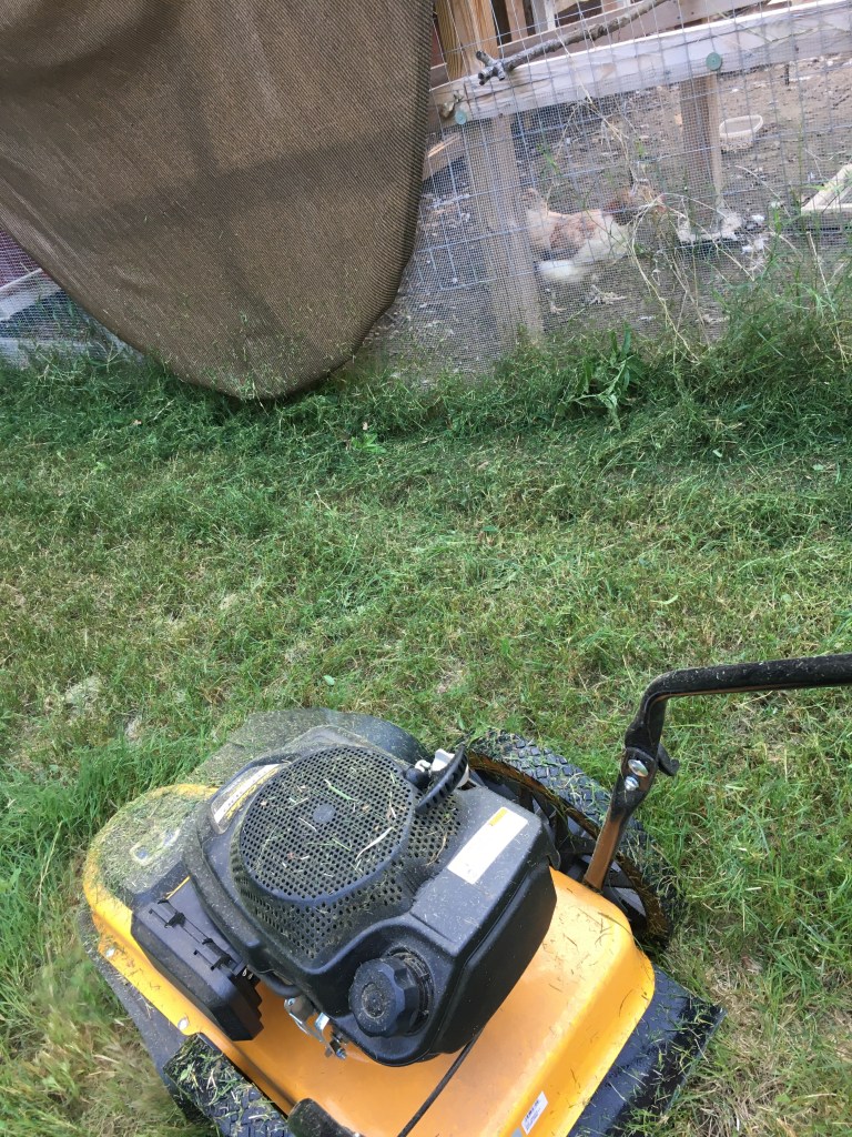 Cockatrice is my one brave chicken that dares to roam the run while I use the trimmer mower on the meadow. She has figured out that the grasshoppers jump in to escape the trimmer. All the other hens hide in the coop while the scary machine roars.