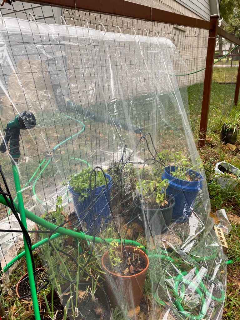 Since my herbs are all in pots along the fence, I thought I could try a tent-like green house made of two clear shower curtain liners. The liners are inexpensive and come with handy holes at the top! I thought this might be easier than dealing with a plant blanket. I had a set of shower curtain hangers (because I am using a pretty snowy tree scene shower curtain as my Zoom backdrop which came with rings), and those hooked into my wire fence easily. I hung one curtain on each side and weighted the bottom with rocks and brick. I’m hoping this will keep my basil alive for a little longer through the cold snaps. The oregano and peas (or should I say pea) did fine without much protection last winter, but the basil turned black at the first breath of cold.