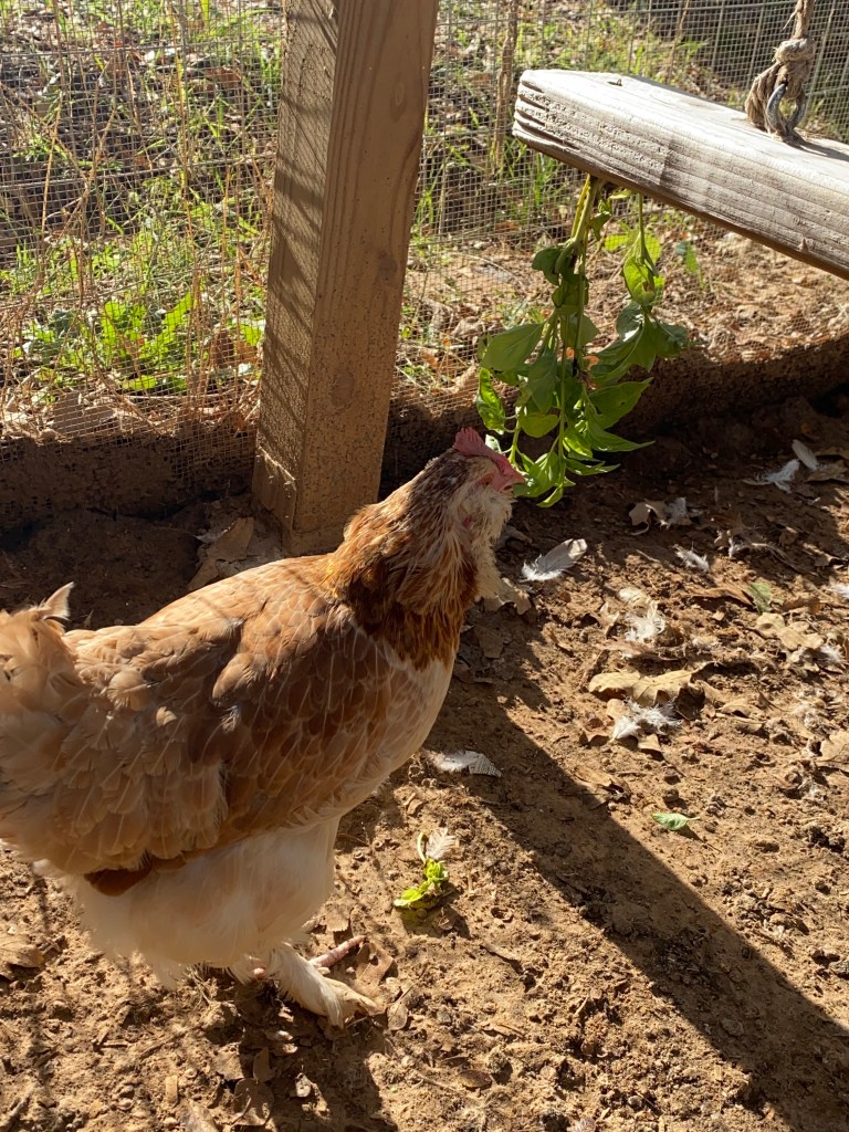 I have a steady variety of greens going out to my hens. I sprout alfalfa and mung beans in a counter-top seed sprouter and take out the wee seedlings when they are ready (I know it is time for the bean sprouts to go out when they lift the lid and make a bid for freedom). The wheat grass salad bars in the runs have been thriving with occasional reseeding. I discovered I can wedge several stalks of basil in the hole in the chicken swing (the basil stalks are quite sturdy and this secures the stems so the chickens can pluck off bits of leaf). And I still do hang the occasional cabbage or pumpkin for consumption. (I bought the cabbage intending to make sauerkraut, but jars are ridiculously expensive right now, so I’ll try another time!)