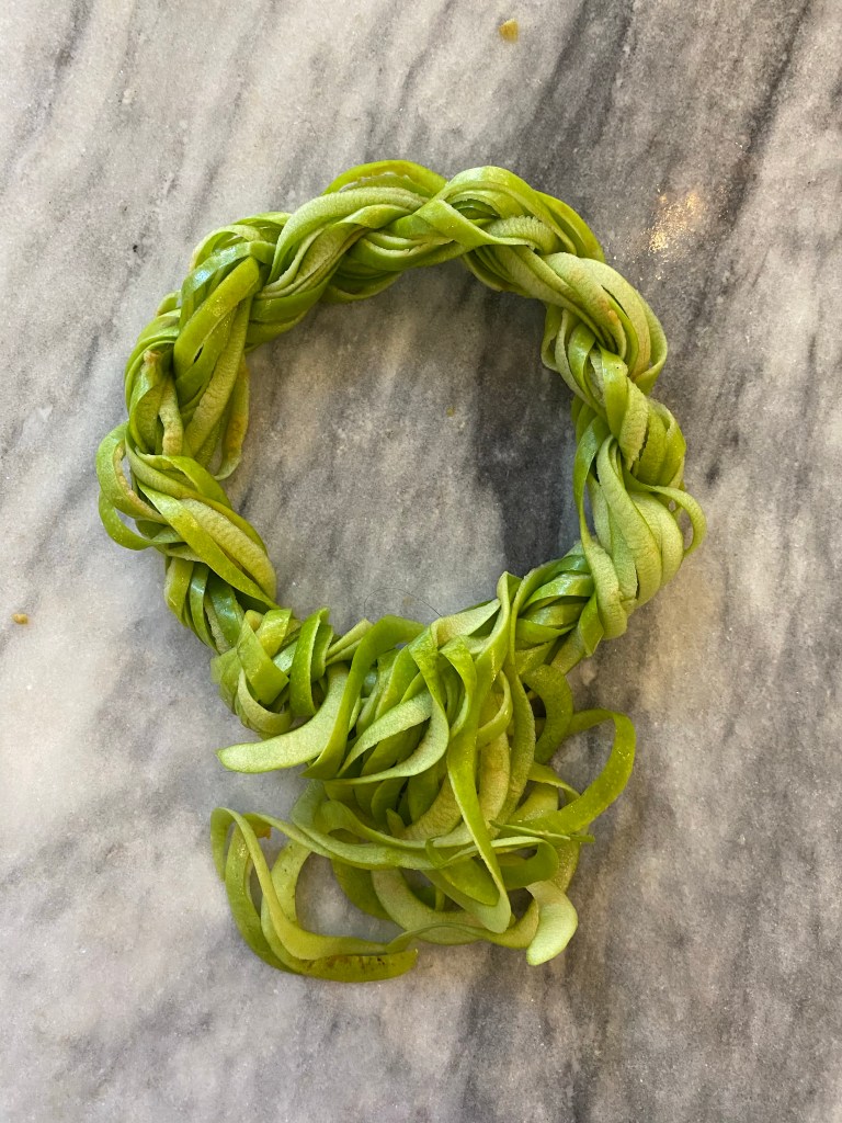 I made an apple pie, and had a bundle of peels left over. (I used a peeler/coring/ slicing device, I certainly didn’t hand peel all those neat strands!) The chickens love apple, but I don’t want them ingesting long strings, so I usually chop up peel, but this time I had the idea of twisting the strands into a wreath shape so the hens would have to pick off bits.