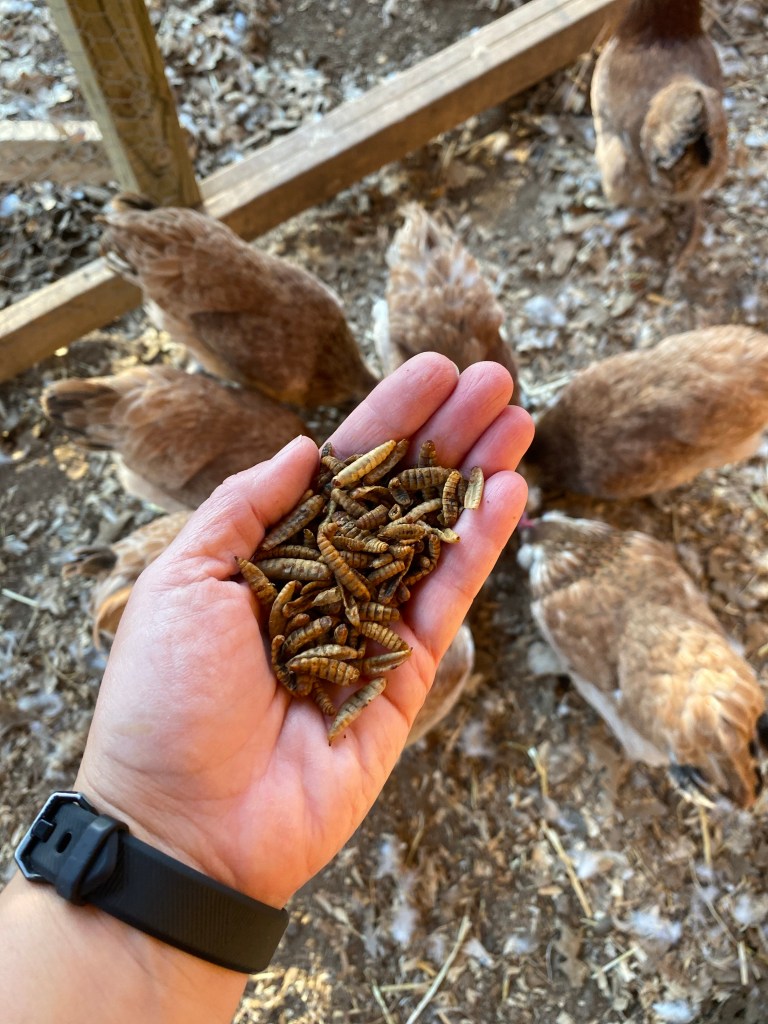 These are the oven dried grubs of the black soldier fly. They have more calcium than dried meal worms, so I switched when I noticed the hens’ eggs were getting thin (back when they were still laying, long, long ago). At first I mixed the grubs and mealworms, then slowly moved to all grubs. Most of the hens didn’t care, but I had two that gave me the stink eye for withholding the mealworms. Happily, after about two weeks, even the recalcitrant birds were chowing down.