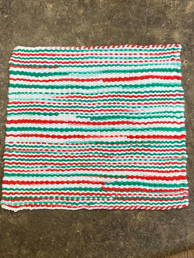 So I’m learning. I blocked (got it wet, laid it flat to dry) my variegated yarn washcloth, and although the pattern of the yarn was interesting, my edges are definitely wonky. The sides are a little better where I used the meet and separate method described in Rebecca Mezoff’s book, and it also changed the variegation pattern, which is neat. (The three sections where the lines are thicker are done with two bundles of yarn, rather than taking one bundle all the way across.)