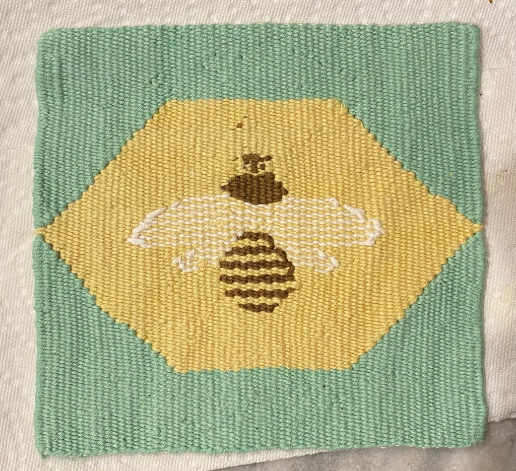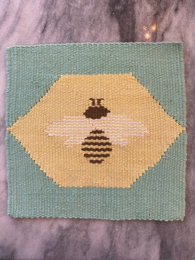This weaving had a two fold inspiration. My sister loves bees, and my daughter recently has been drawing the cutest simple bees. I did ask my eldest if it was OK that I borrow her bee style!