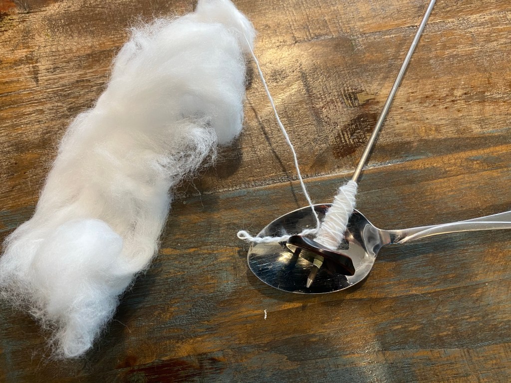 The spindle is one I made from an old button, a rubber band, and a steel mandrel (I used to make glass beads). I couldn’t find the spindle stand, so I used a serving spoon.