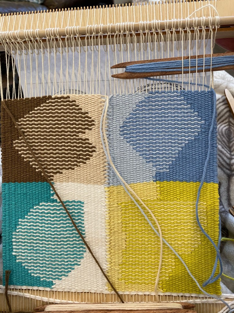 I had a hard time finishing this weaving. I had the idea of forming shapes using only hatching, but my design was not a good and one. I wanted four basic leaf shapes, but half way through I realized that two of the shapes wouldn’t work the way I laid it out on the paper and I had to wing it. I also don’t like vertical lines, those were a missed opportunity for more hatched shapes. And I really don’t like that the yellow and green I picked for one area are too visually similar, so the shape is all but lost. But. Now it is done, can be used as a washcloth until it dies, and I can move on to other things!