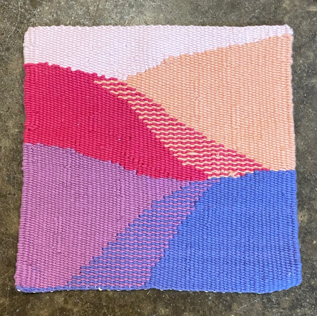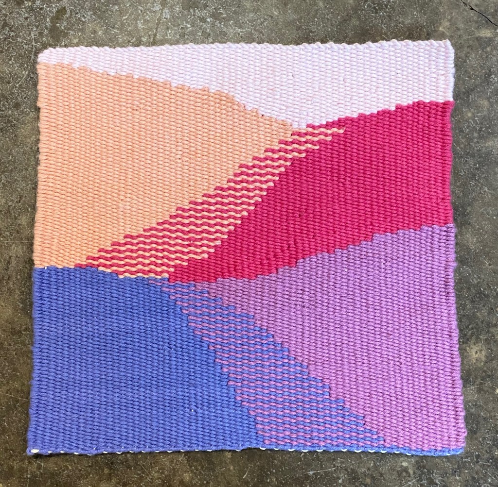 Details: approximately 8”x8”, 100% cotton weft, warp suspected cotton (from stash), woven on an 8 sett frame loom. First and last pass twined. Warp drawn through piece to finish.
