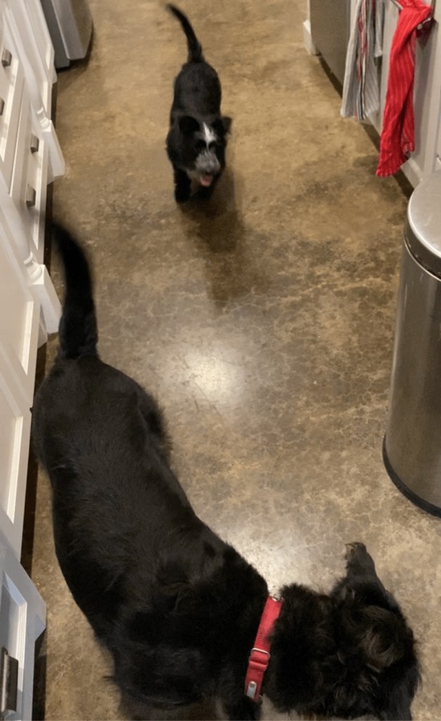 When it is wet and muddy outside, I try to find a way for the dogs to get their exercise inside. I recently discovered that by strategically using a laser light, I can get them to loop the kitchen island! Over and over. Which is both entertaining and exercise. One of the benefits of lunging a horse is to get the sillies out and calm them before riding, especially for excitable horses (I’m not a horse trainer, this wisdom comes from others!) Turns out it works for dogs too. Here is a short video of my dogs running circles.
