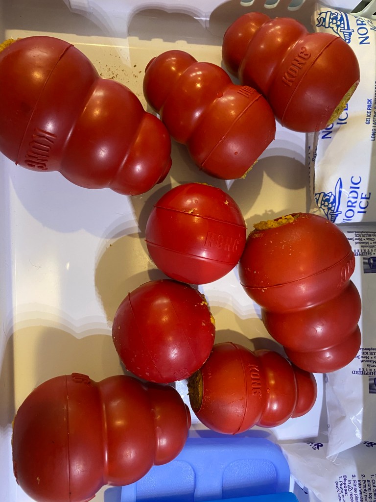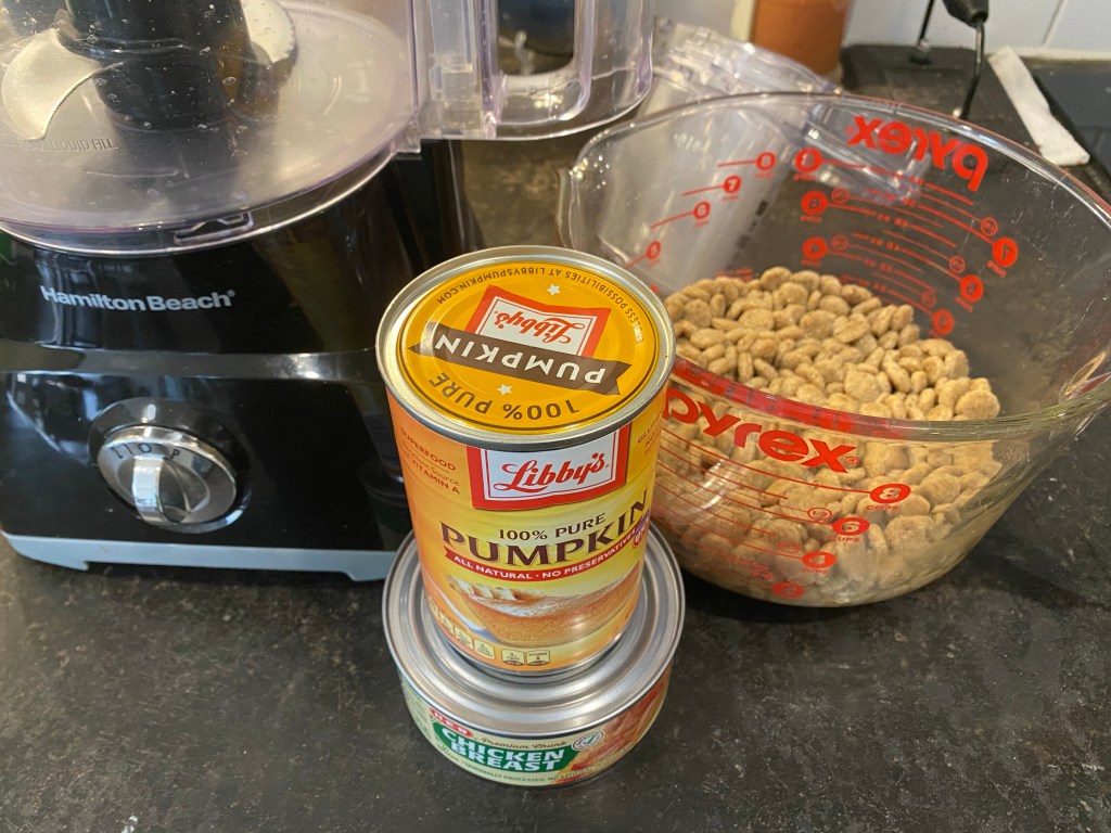 I’m feeling rather accomplished, making my own stuffing for dog Kongs! (It doesn’t take much to amuse me these days.) I soaked about a cup of dog food in about two cups of water for a couple hours, then to further cut calories added pumpkin and canned chicken and blended the mixture in my food processor. The result was a paste that was easy to pack in the Kongs, which I then stuck in the freezer. The dogs enjoy them too! I’m trying to be sparing with the peanut butter since I recently read that the high fat can trigger pancreatitis, and these keep them occupied for a good while!