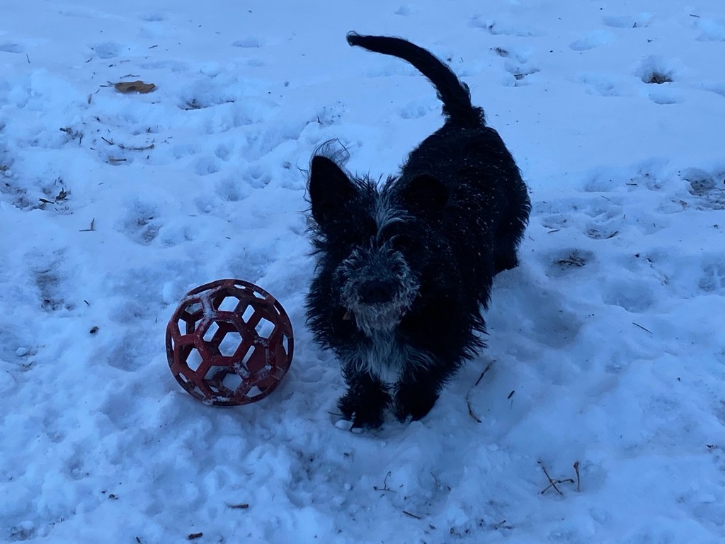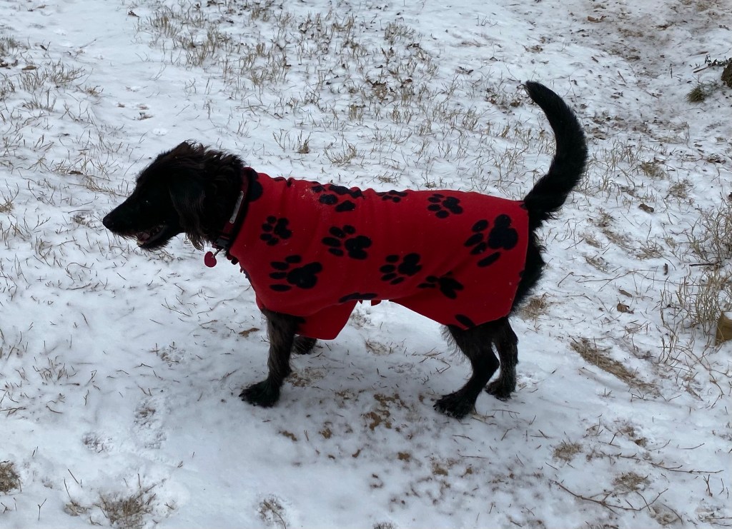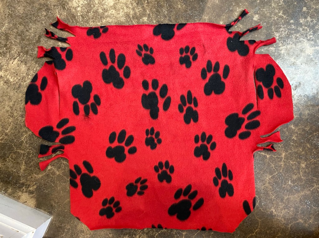 This is unprecedented cold for Texas. Griffin usually doesn’t care about the cold, however zero degrees is a whole other matter. He outgrew the sweater I knit for him ages ago, and we needed something so he could at least go out for a couple minutes to do business. So I took some fleece earmarked to make beds and used some to whip him up a coat. I measured around his chest and added a couple inches, then measured from neck to tail. I cut a rectangle using those measurements, then cut leg holes and shaped around the hips. Strips cut along the neckline and chest made it easy to tie the sides together rather than sewing. Within about 10 minutes he had a new coat. He loves his coat!