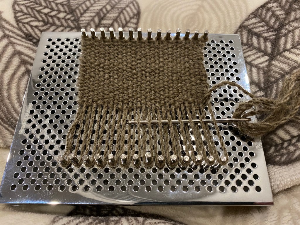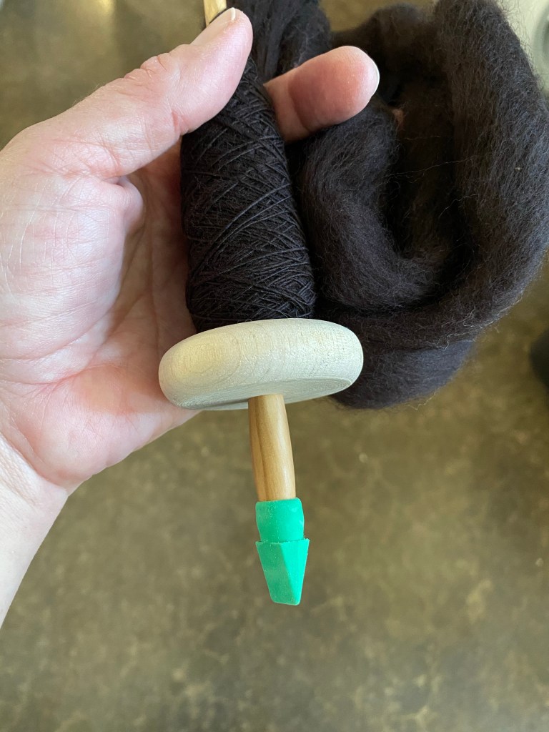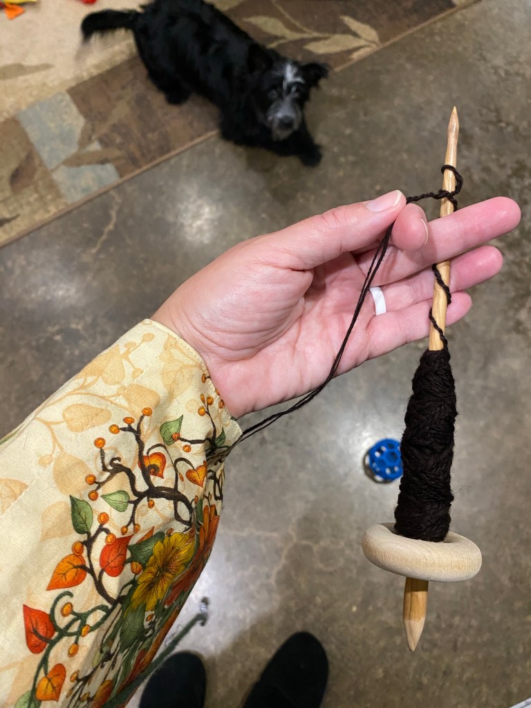 I transferred the singles from my spindle to a niddy noddy, rinsed them to set the twist, then let them dry before winding them into cakes. I did all this rather than plying from cops because I wanted a smooth center pull for plying. To ply, I tucked the yarn cakes into an arm bag that I made long ago for carrying crochet yarn. They fit perfectly! And it is easy to feed the two singles from the bag and ply. I have also discovered that it is easier to get my spindle spinning counterclockwise if I flick the bottom instead of the top.