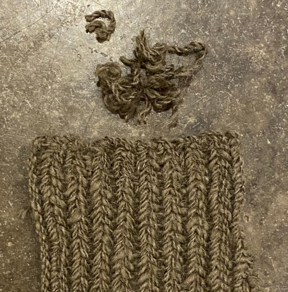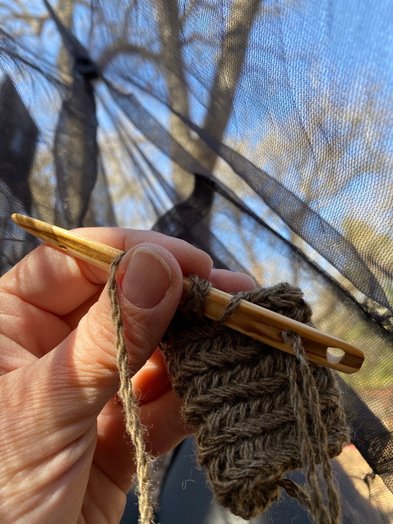 Nålbinding swatches made from hand spun merino woolNålbinding while laying outside in a hammockCleaned up the cut edge by removing the partial threads, snugging up the attached threads and running them down the back of the work