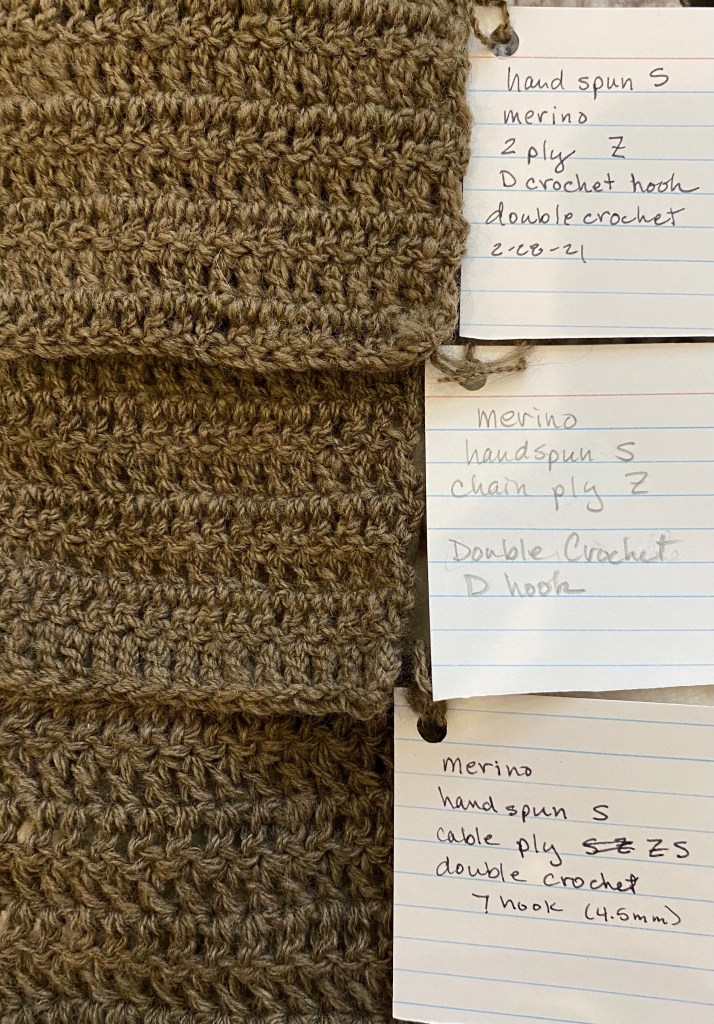 What to do with wee balls of yarn? Swatches! The experiments on my hand-spun yarn continue. I crocheted up a swatch from each of the three balls of yarn, one two-ply, one three-ply, and one four-ply. I used a double crochet stitch for each swatch, but used a different sized hook for the four-ply. I’ve labeled each swatch (as you do) with a bit of hole-punched card stock.