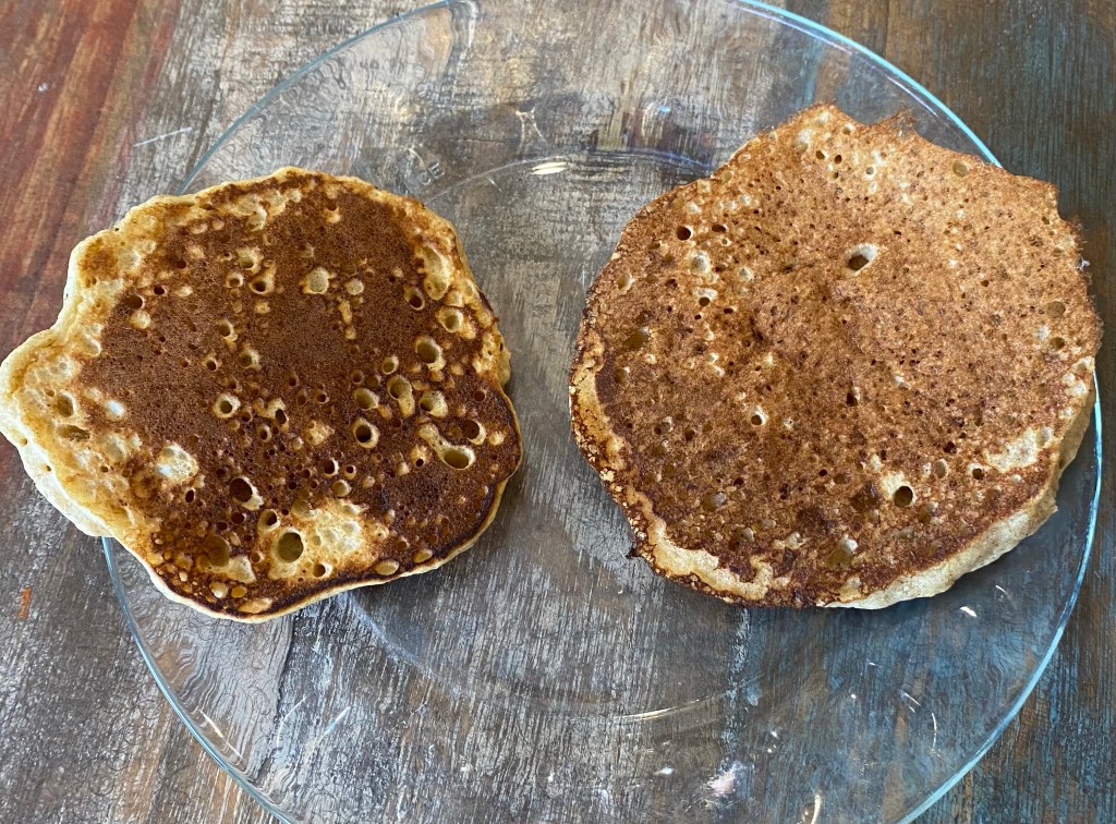 Almond and oat pancakes made with fresh eggs (left) and reconstituted powdered egg (right)