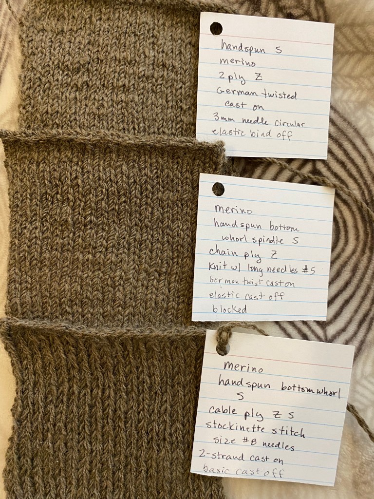 All the knitted swatches had to be blocked because stockinette stitch is curly. The 2- ply was the softest, but the S plied four-strand had the most balanced stitches (the right and left side of each loop have the same number of twists). Most commercial yarn has an S ply.