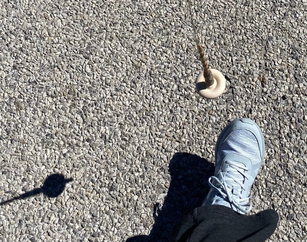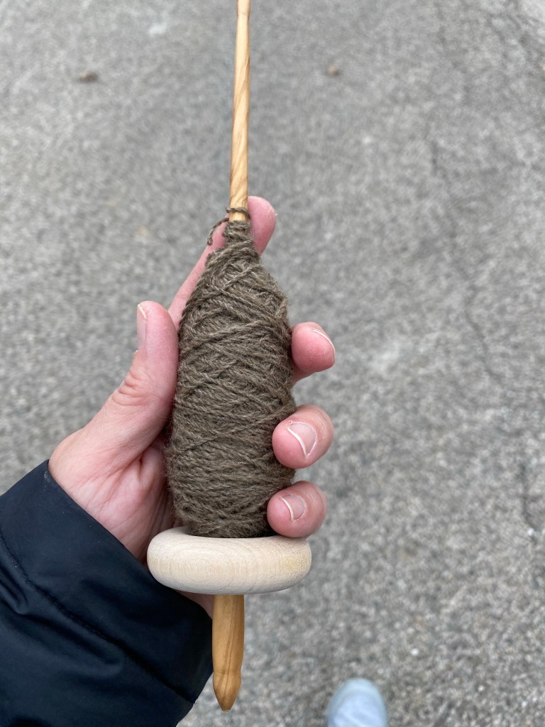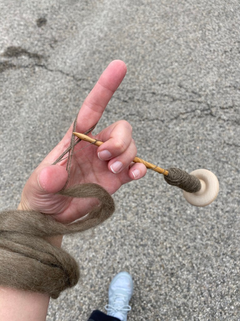 I think this is another advancement in my spinning. Before, I didn’t understand the why of the butterfly. I would spun an arm length, then wrap it up on my spindle. I was able to keep tension on the yarn the whole time to keep it from kinking. The butterfly comes in when you are able to spin more than an arm length. As the spindle nears the ground, and my hand is high in the air, wrapping the yarn around two fingers takes up the extra length under tension and allows me to wrap more around the spindle without troublesome twists.