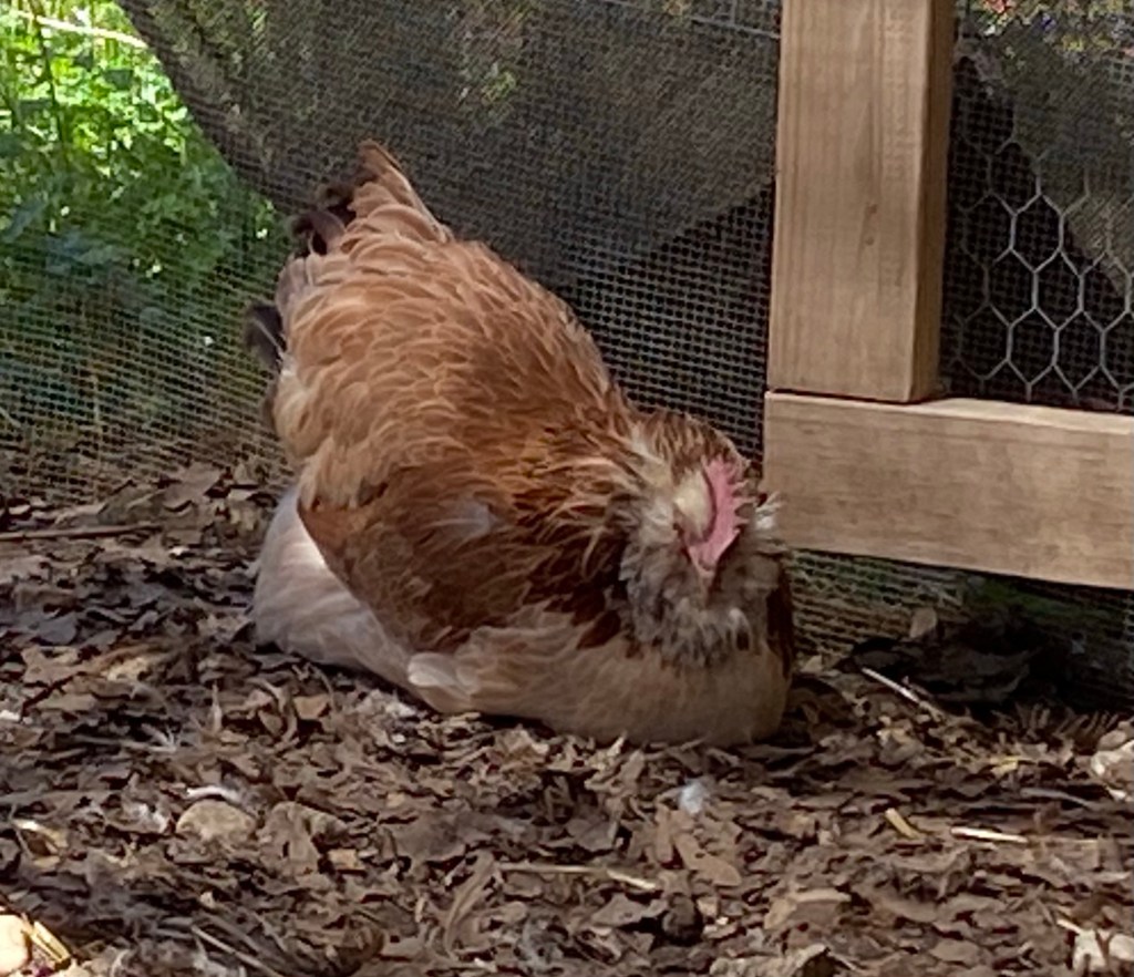 Taco is a strange bird. Well, her name is Taco. She is the least people friendly and the hardest to catch. When we sit in the coop, she is usually the farthest away. I caught this picture of her taking a nap as my youngest and I hung out with the flock for a bit. With her tail feathers nearly straight up in the air. The others settle with tail feathers up as well, but not nearly to that extreme angle.