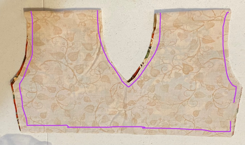 Purple lines indicate sewing path, with gap so the fabric can be turned right side out