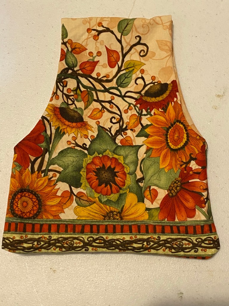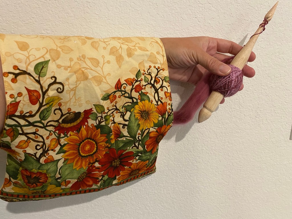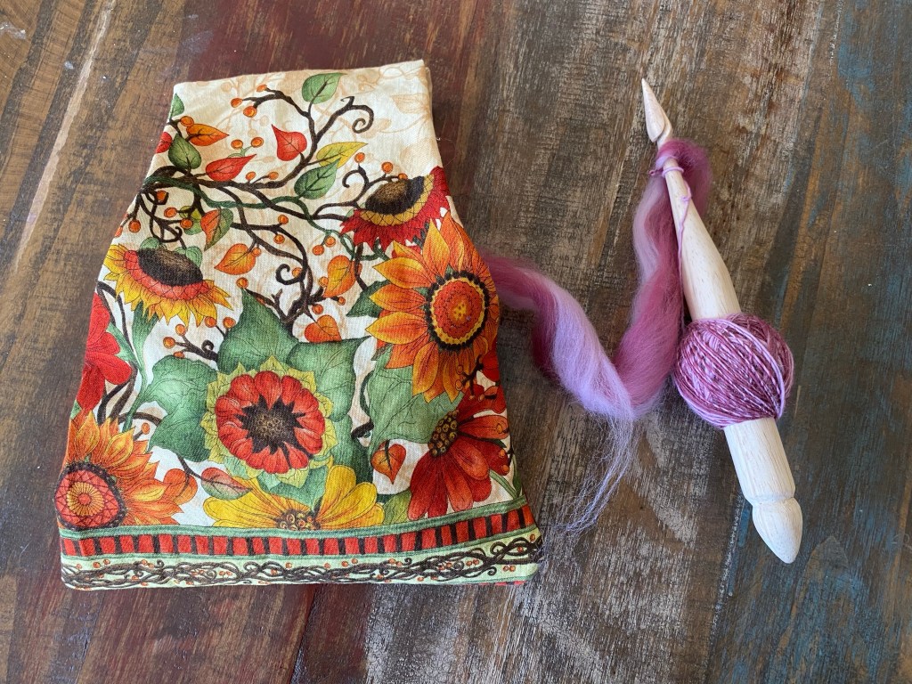 I have a small arm bag that I made to hold my crochet yarn while I work. It hangs on my arm, so my supplies are close and don’t get tangled. I thought I would try the bag for fiber management for spinning, but the bag is full of a current crochet project, so I made a new one! This is my favorite fabric. When I found it in the store years ago I bought the whole bolt. I have been slowly working through it for various projects, and each time I marvel at the colors and the composition. Since it has a thick border and the rest is a more subtle background vine, it works perfectly for a lined bag.