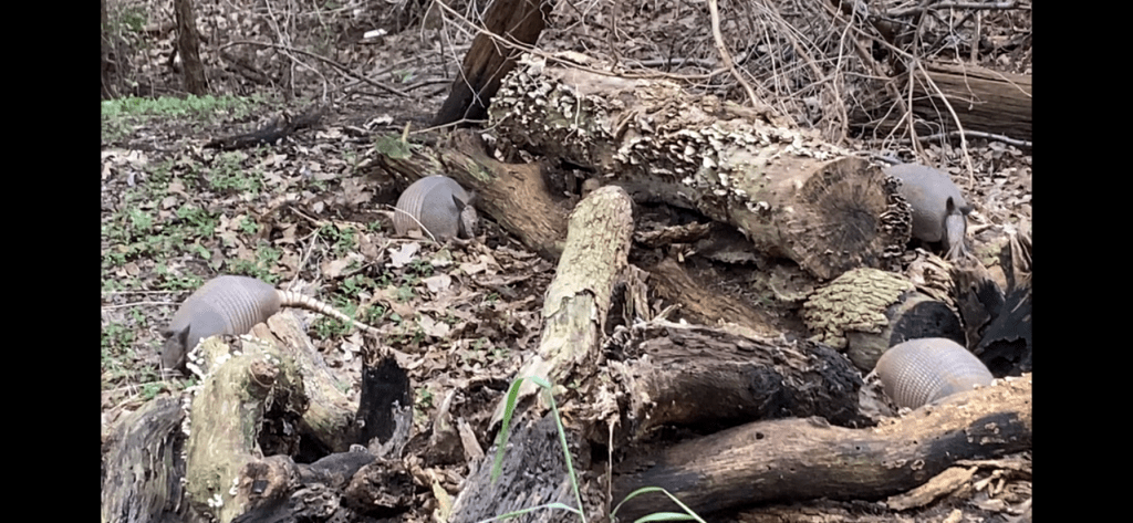 We were eating lunch and saw some nine-banded armadillos foraging in the back woods during a cloudy afternoon. These are probably last year’s litter, as they seem to be full grown (the cats are 10 pounds, and they look about the same size).The two cats (Big Orange Tom and Sophie) prowling the area completely left them alone. Nine-banded armadillos are insectivores and these are digging for grubs and worms. I recorded for 5 minutes, within 6 feet at times. I’m not sure they even knew I was there. Sorry for the shaky footage, the mosquitoes were eating me alive. Totally worth it!
